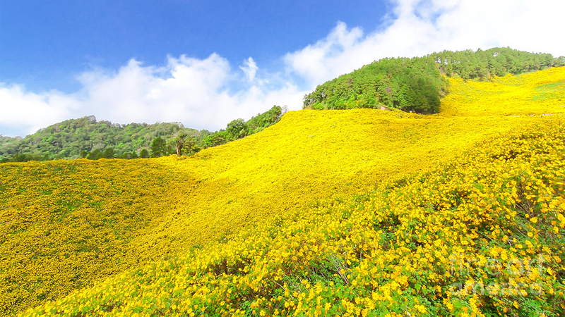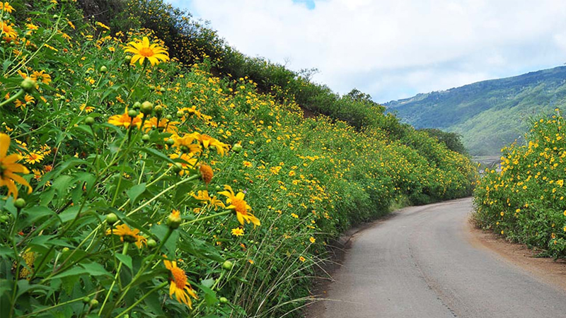This is considered the "legendary" and most comprehensive route to witness the majestic beauty of the wild sunflowers. The flowers not only bloom along the road but also cover entire hillsides in gold, creating a truly impressive scene.